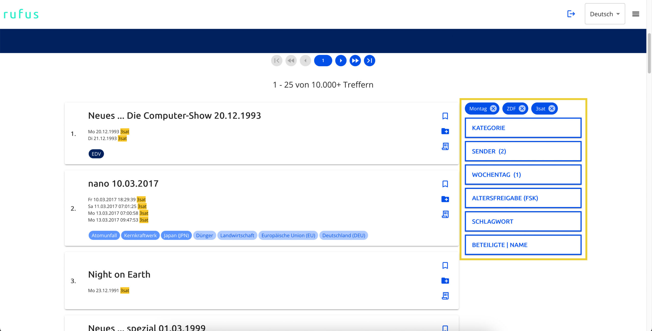 Wählen Sie beispielsweise ZDF und 3sat bei den Sendern und Montag bei den Wochentagen, reduzieren sich die Ergebnisse auf Sendungen, die beim ZDF oder bei 3sat ausgestrahlt wurden und mindestens eine Ausstrahlung an einem Montag haben.